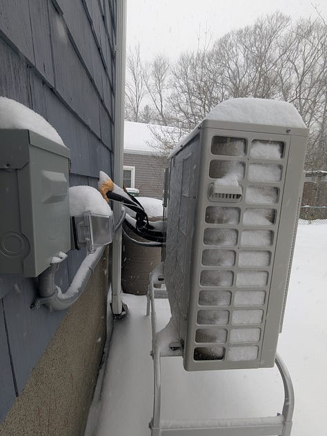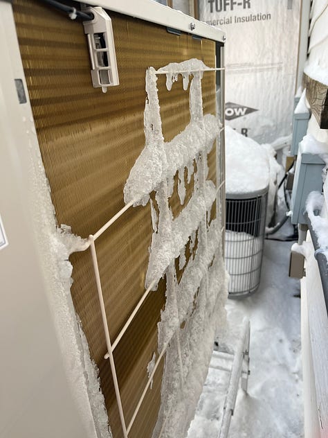 I was here in college back in 2015. Walking around this week, I’m reminded of 2015. These days, however, we have cold-climate heat pumps. And every heat pump we install has a defrost mode, which reverses the refrigerant cycle to heat up the coil & defrost the ice.