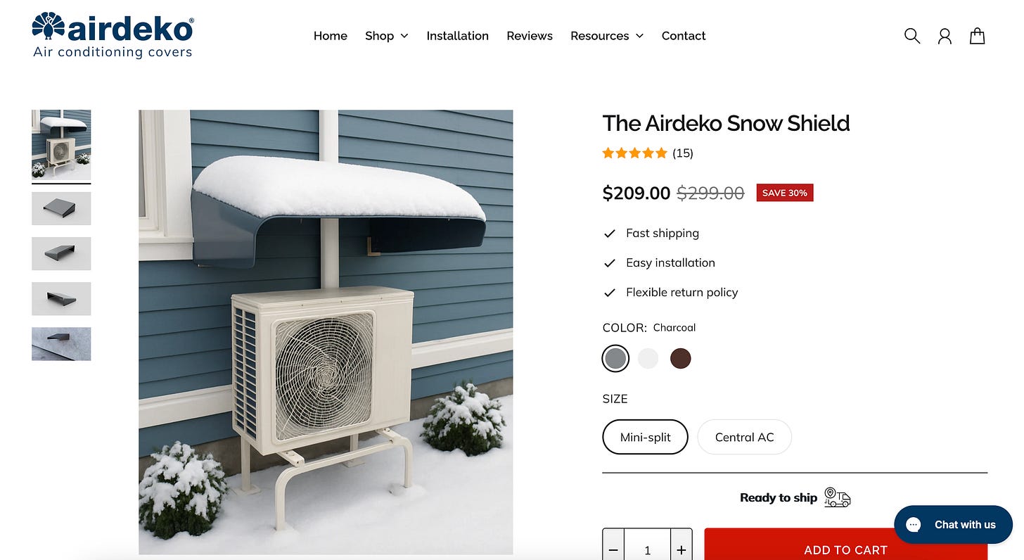 While this won’t help if your outdoor unit is in a windy spot in an alley where snow gets whipped up on the regular, or from frost accumulating simply due to the humidity, it will help shield some of the snow from above.