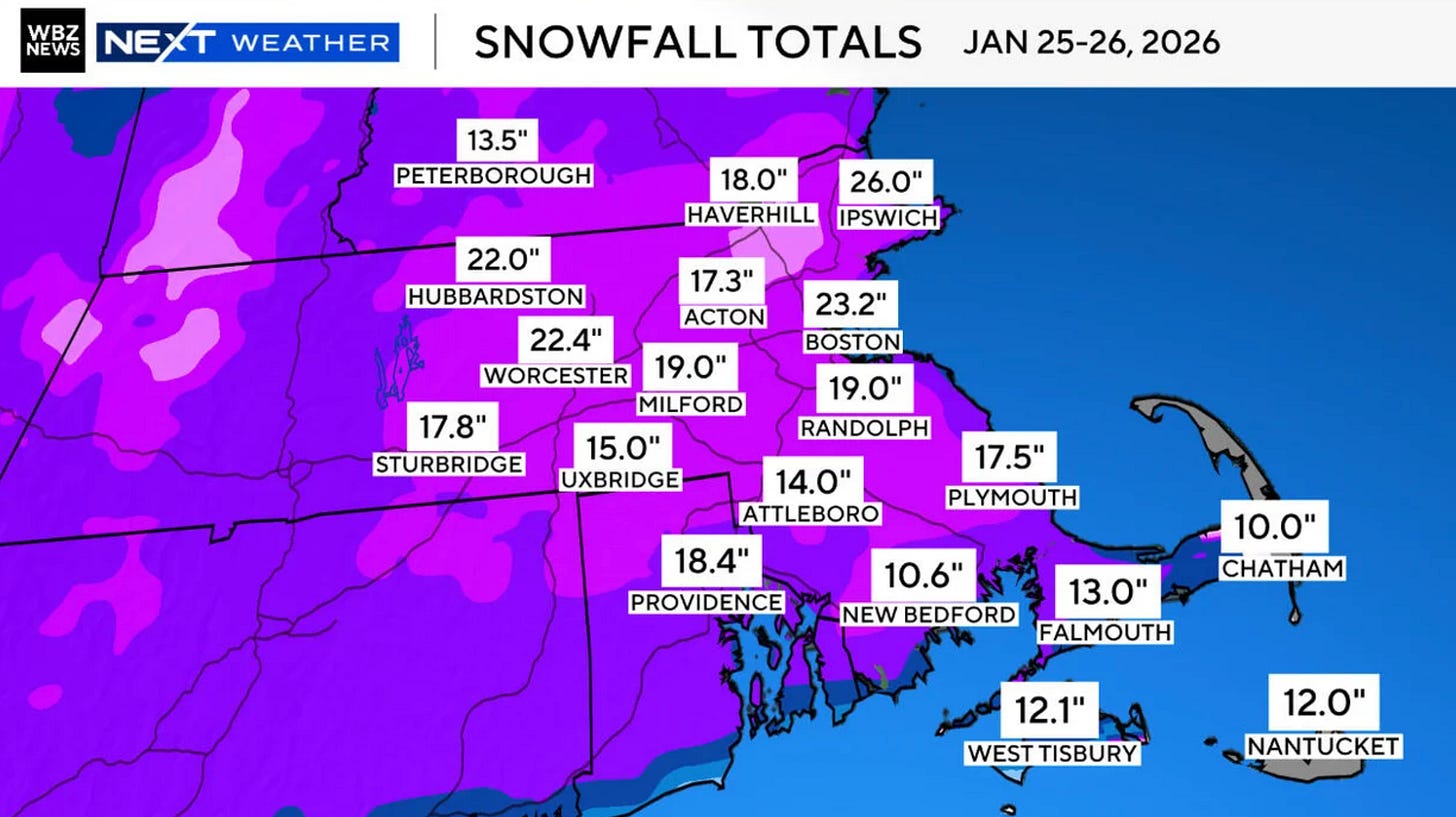 It’s official. After 20+ inches in parts of the Boston Metro area, the January 25th snowstorm of 2026 is a TOP 10 snowstorm in Boston history.