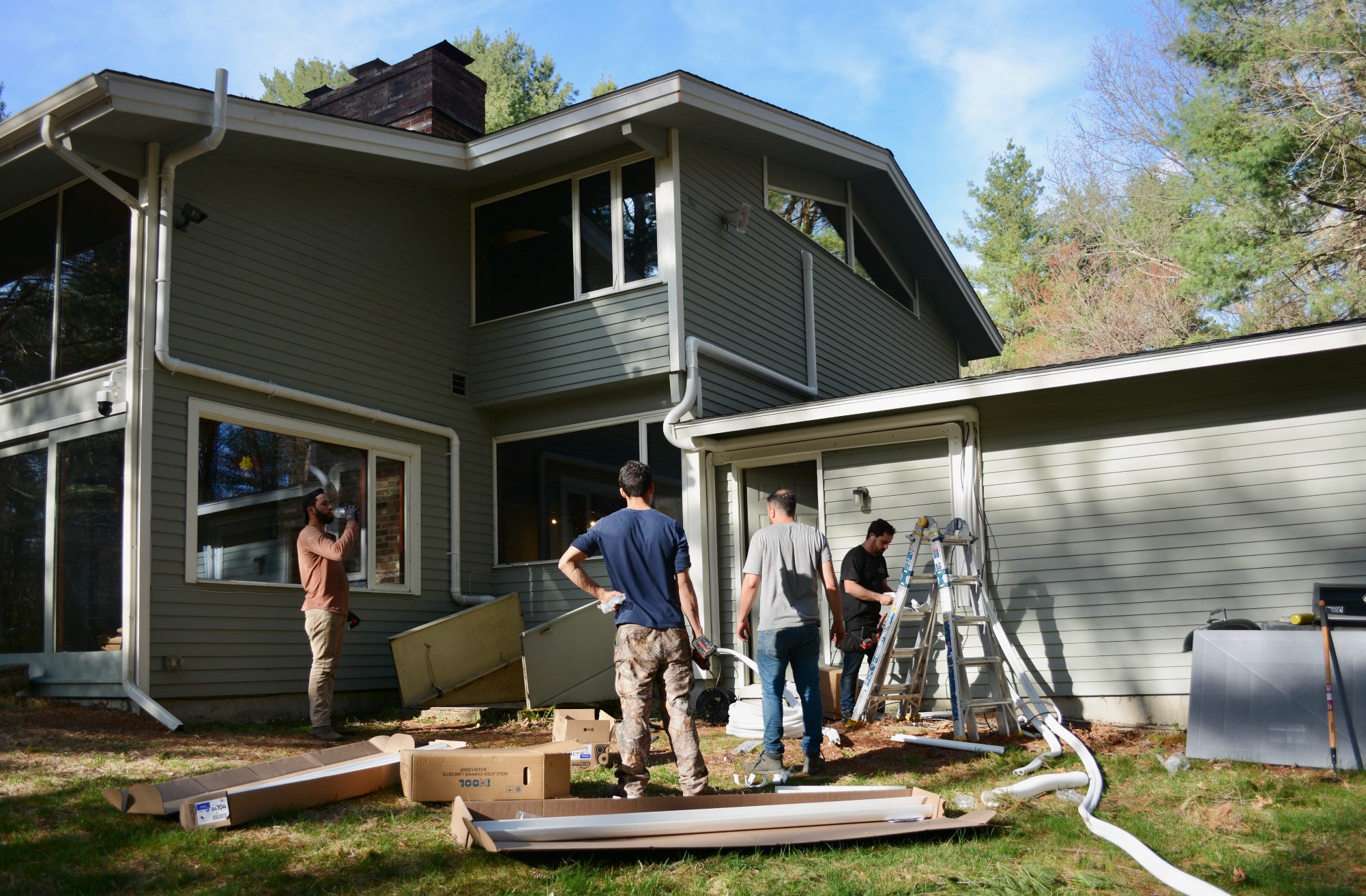 Crew arrives. Unboxes condensers, line set, materials. Crew lead gets a walkthrough of the house interior & exterior, confirms mini-split head placement with homeowner for each room, and team discusses line run routes based on preliminary discussions.