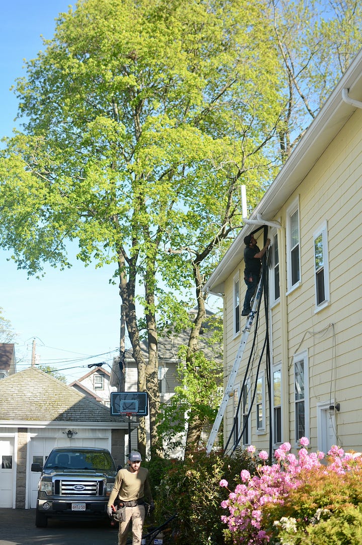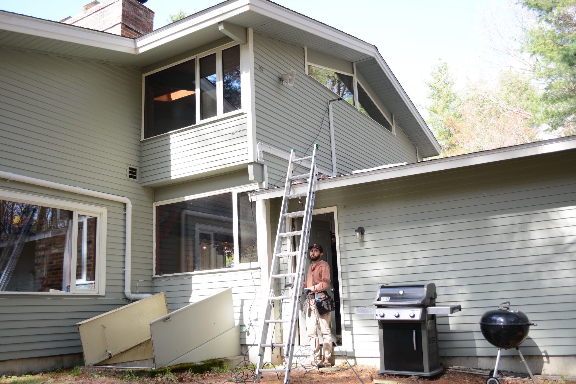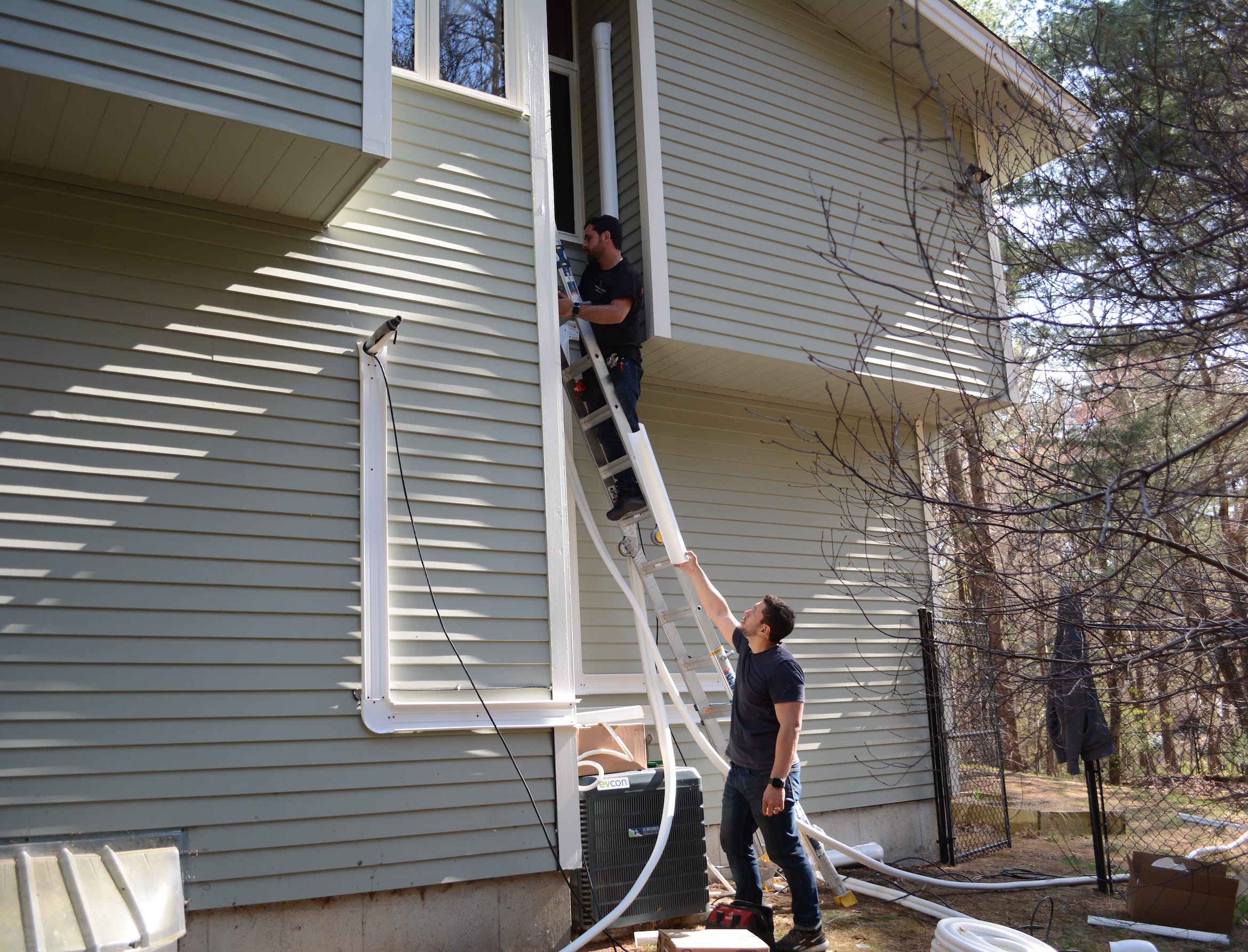 You’ll need to drill a hole, then run lines through it. In this case, they’re drilling the hole right underneath the soffit. What follows is the fairly physically exercise of pushing lines through a hole that’s just small enough up to 2 stories, up a ladder.
