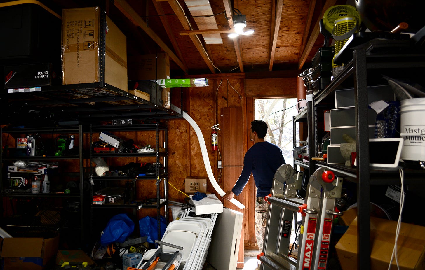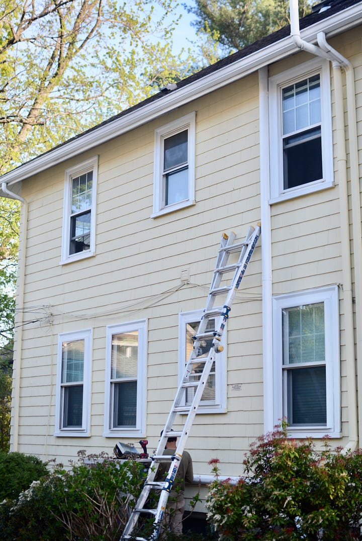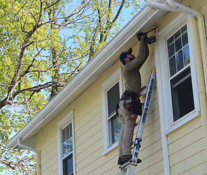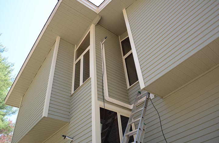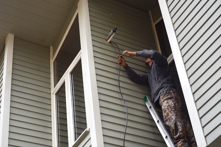 You’ll need to drill a hole, then run lines through it. In this case, they’re drilling the hole right underneath the soffit. What follows is the fairly physically exercise of pushing lines through a hole that’s just small enough up to 2 stories, up a ladder.