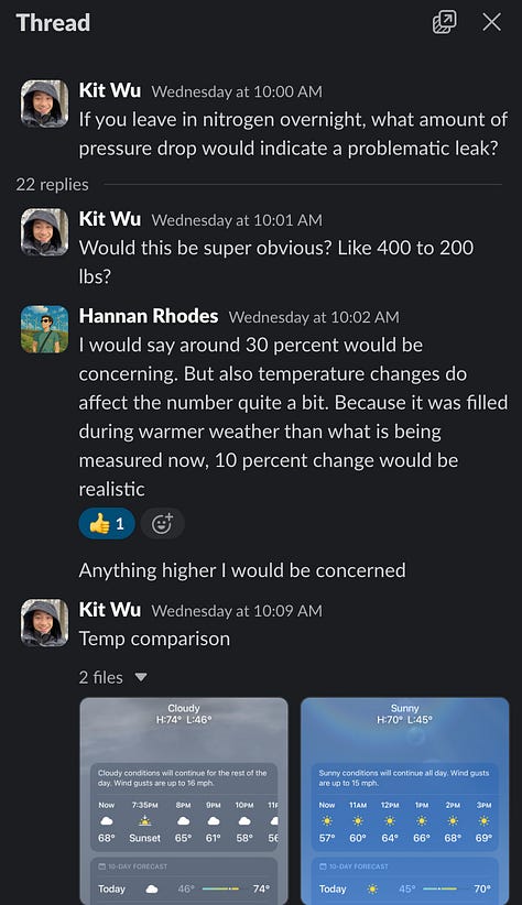 A bit more nitrogen left after reconnecting the pressure gauge. But the morning reading was 445.1, which we felt good about accounting for the nitrogen briefly escaping. A bigger drop would have been more concerning.