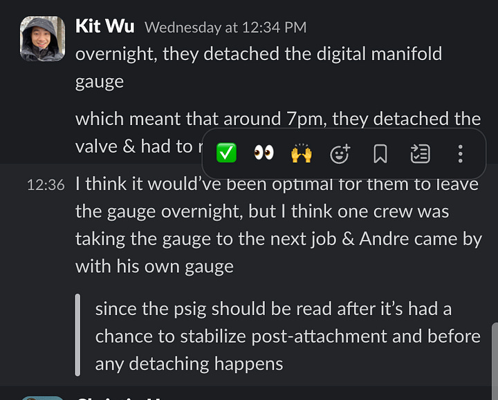 We’ve previously done overnight pressure testing with this crew at the Lincoln installation above. You can see on the digital manifold gauge here that they’re holding pressure at 470.3 PSI, which we stared at in person for about 15 minutes.