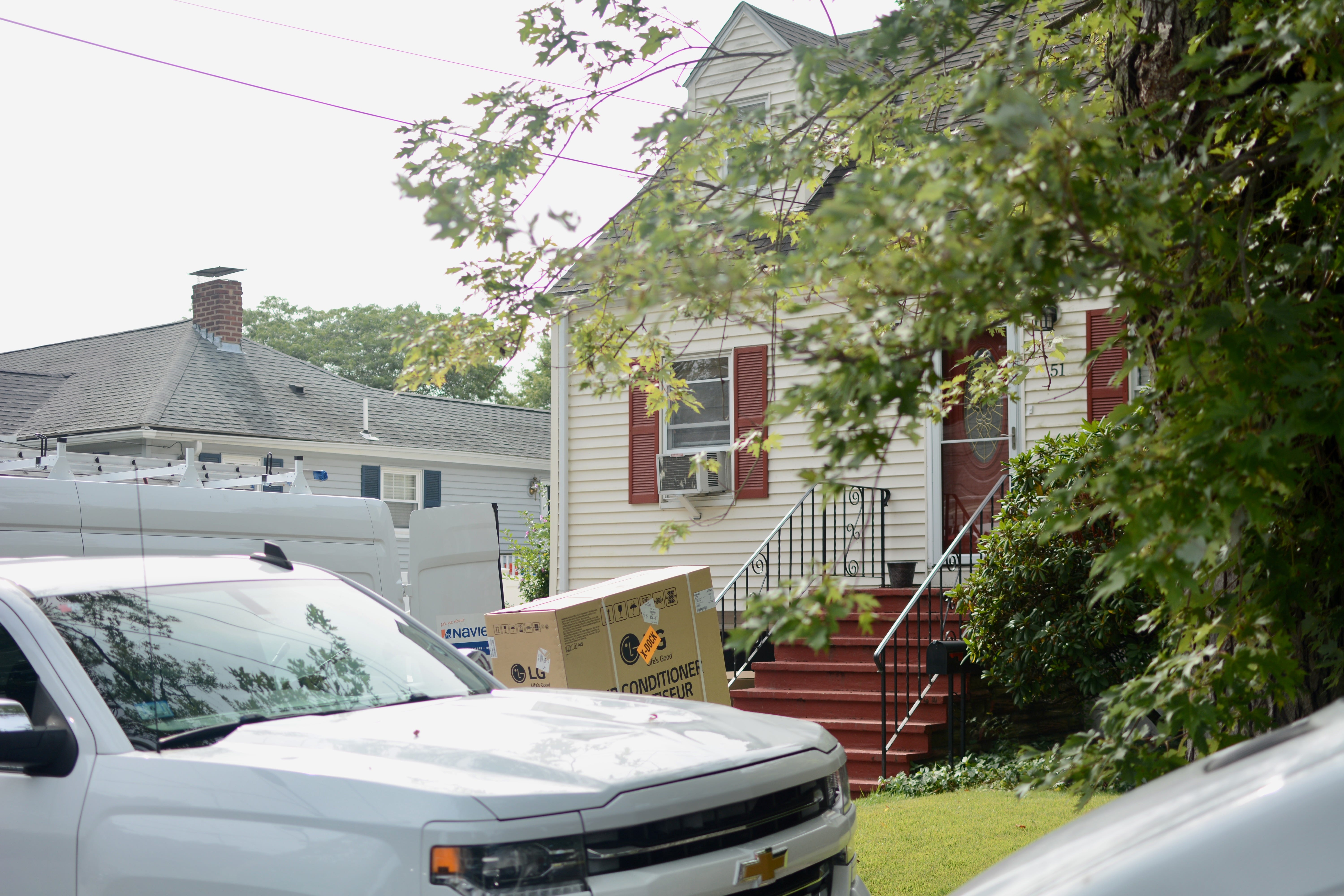 Day 1 - Supply run & kickoff. Mini-splits are mounted on the walls. Line cover starts going up. Refrigerant lines are run, and cover may/may not be completely on by the end of the day. Condenser is mounted on pad & stand.