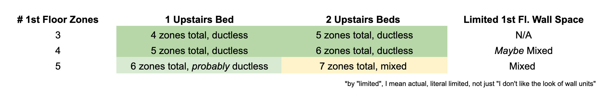 Therefore, if you go ductless, I’d recommend 1 outdoor unit for 5 zones or less, and 2 outdoor units for 6 and above. With 2 outdoor units, you can turn off 1 outdoor unit during the shoulder season, when the heating/cooling load is lower.